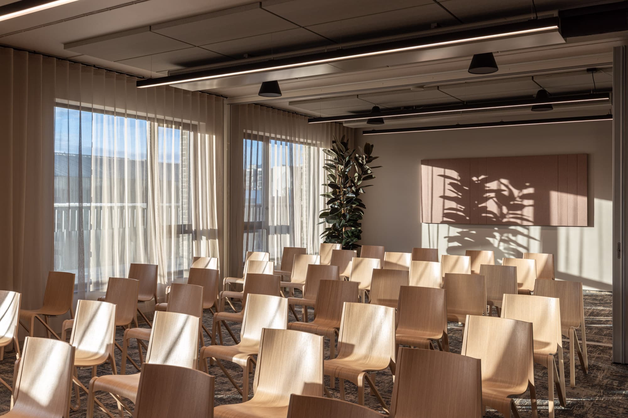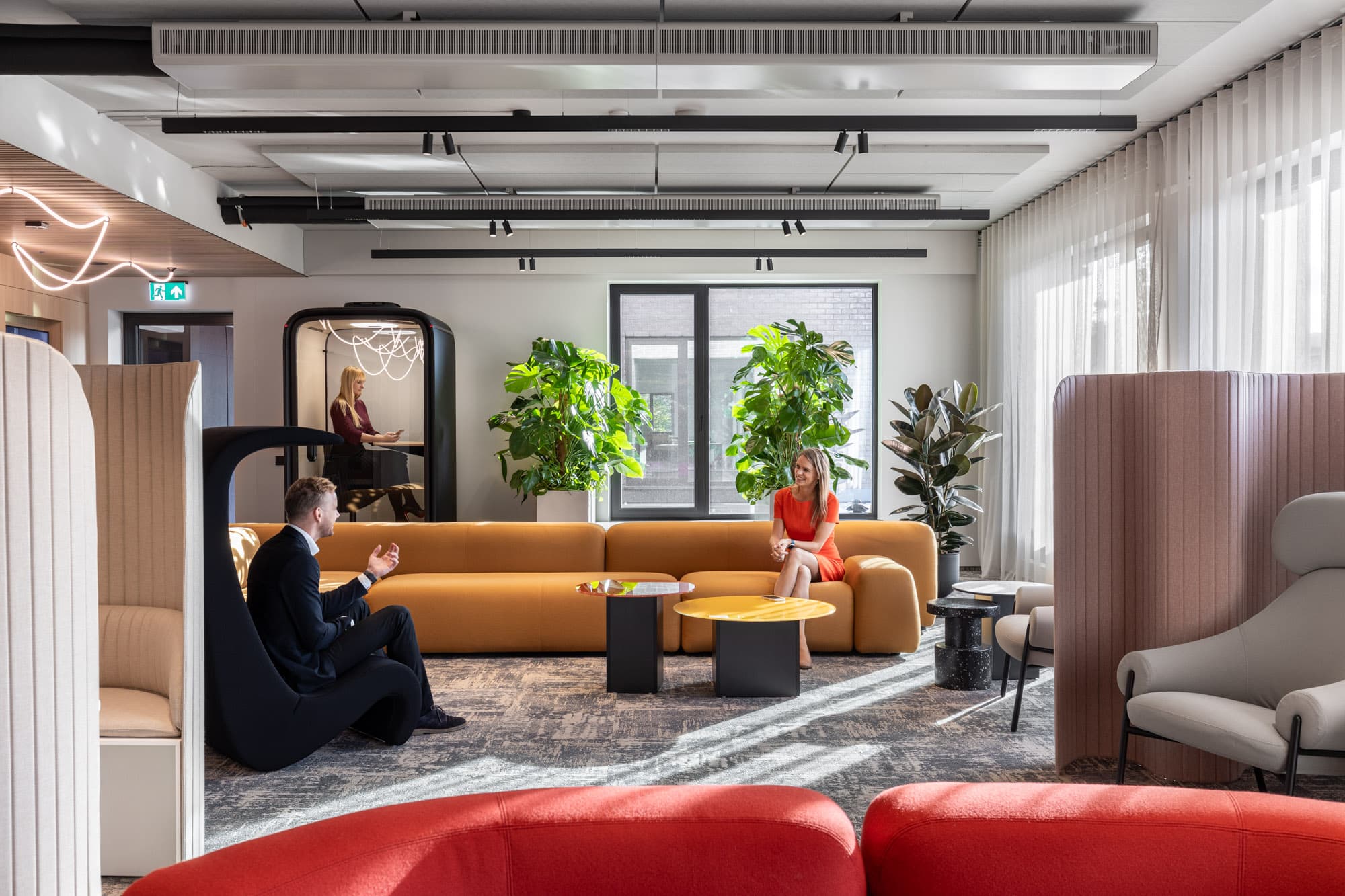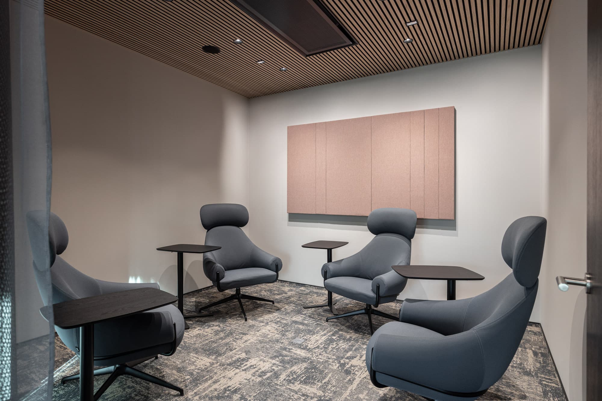 In the conference rooms, it is possible to accommodate up to 60 guests if you need to organize a larger event or presentation. All meeting rooms are equipped with TV screens. We have also considered a children's corner in case there is a need to bring children to the office. Undisturbed discussions or online meetings can be conducted in the latest generation Framery One phone booths.