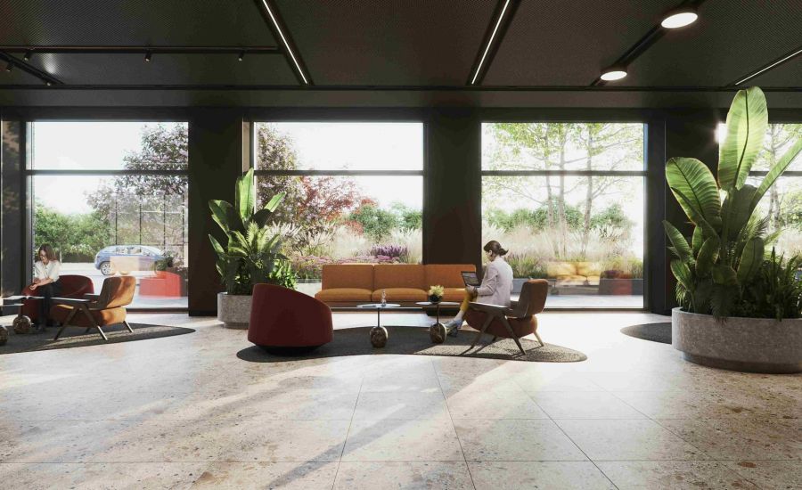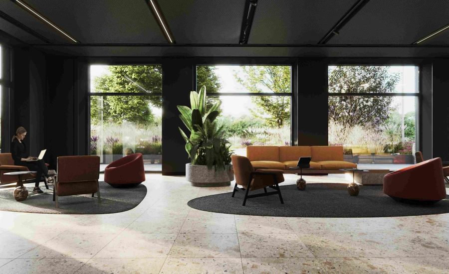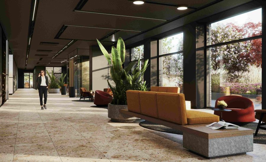 Vestibila telpās izmantotie siltie zemes toņi, lielie logi un bagātīgi izvietotie telpaugi radīs mājīgu un patiesi iedvesmojošu vidi, kas papildināta ar ērtām, kvalitatīvām dizaina un individuāli izgatavotām mēbelēm, savukārt interjerā izmantotie elementi būs praktisks palīgs ērtai navigācijai visos trīs biroju ēkas korpusos.