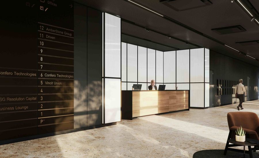 Biroja vestibila interjers tiek veidots sadarbībā ar dizaina studiju RADADARA. Tās komanda šī projekta ietvaros strādā arī pie Latvijā unikāla un neierasta interaktīvās sienas risinājuma recepcijas zonā. Īpaša būs arī pati recepcijas lete – tās apdarē tiks izmantots no Daugavas dzelmes izcelts apmēram 1300 gadus vecs melnozols.